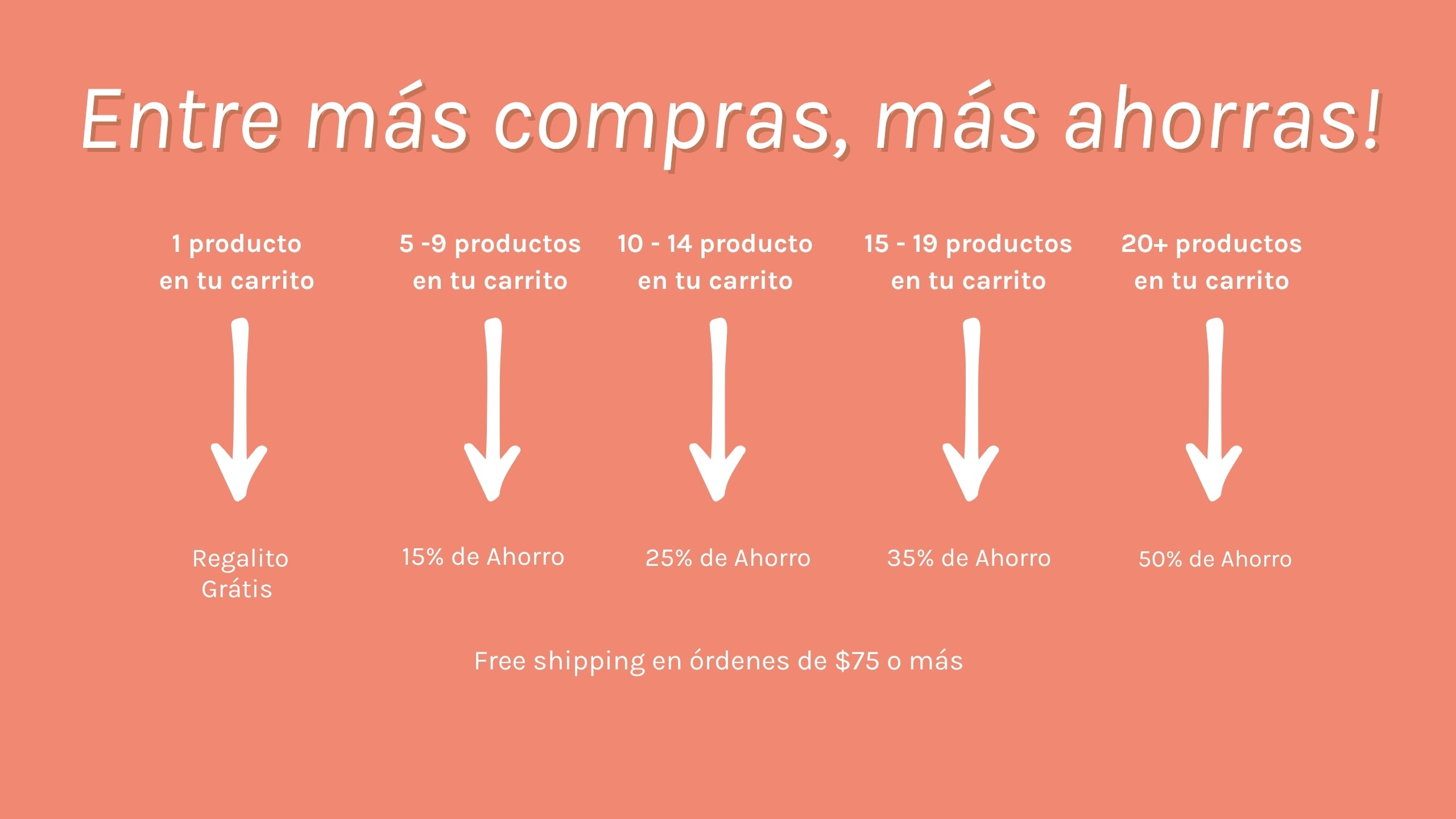 🎁 Añade 1 producto - Recibe 1 regalo gratis • Añade 5 productos recibe 15% de descuento • Añade 10 productos y recibe 25% de descuento • Añade 15 productos y recibe 35% de descuento • Añade 20+ productos y aplica 50% de descuento