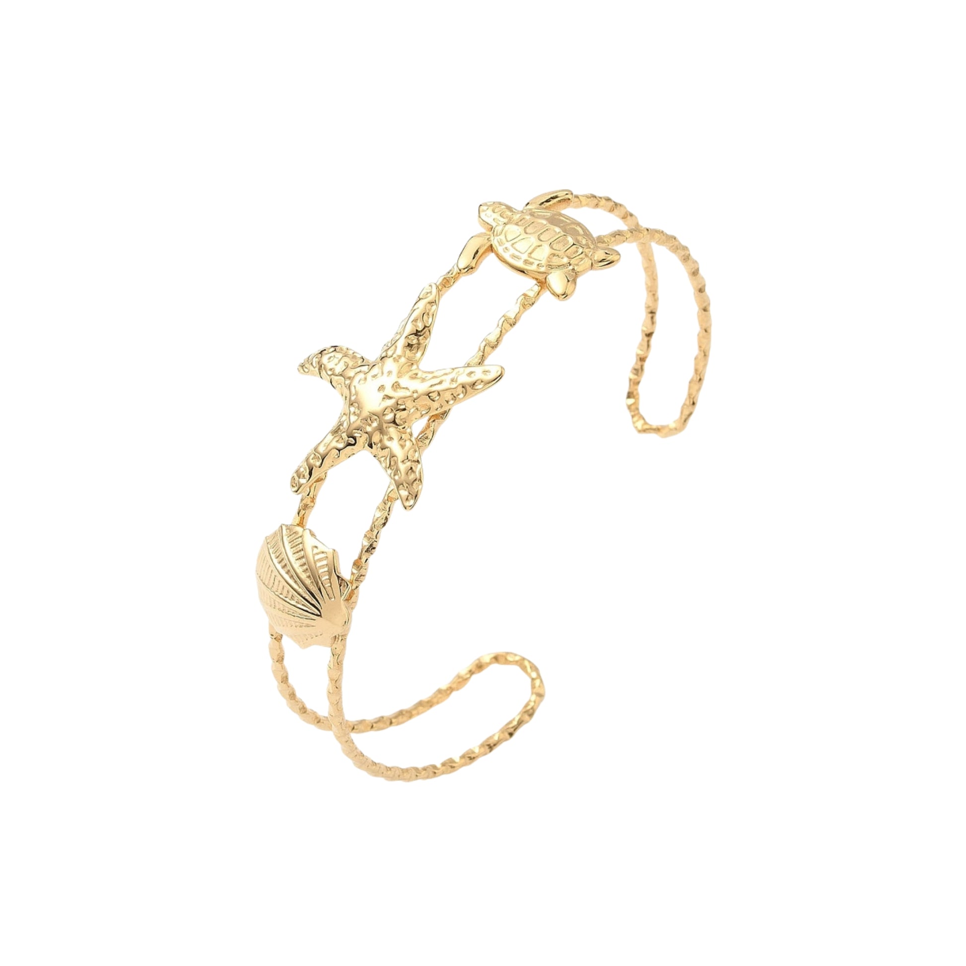 Pulsera Cuff de Stainless Steel con Estrella de Mar, Tortuga y Concha, Dorada
